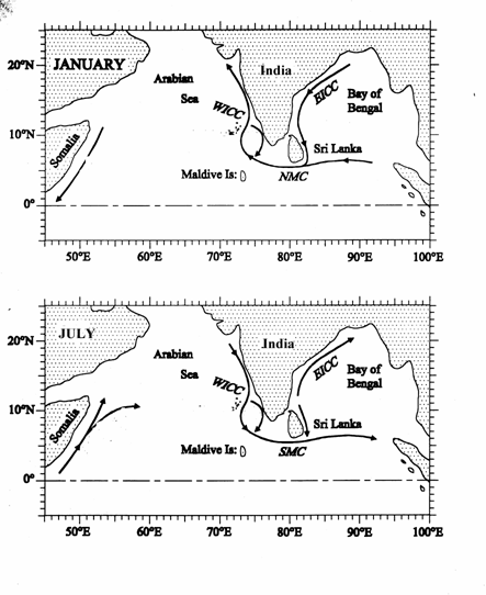 To understand, why such a short-circuit is likely, we need to know about the ocean currents in the Indian Ocean close to Sri Lanka. Here, currents that come travel along the equator, those that come from open seas and those that are driven along the coasts of India, merge, clash and set off eddies and waves. The ocean current is driven from the Bay of Bengal to the Arabian Sea during the North-East monsoon and from the Arabian sea to the Bay of Bengal during the South-West monsoon. During the NE monsoon, the East Indian Coastal Current (EICC) travels down the East coast impelled by the monsoon winds and fed by the discharge of the Ganga and other rivers along the West Coast. These currents are particularly rapid when there is heavy rains or cyclones. During the South-West monsoon, the West Indian Coastal Current (WICC) travels down the West Coast. To the South of Sri Lanka, the Equatorial Monsoon Current (EMC) flows West and East during the South-West and North-East monsoons respectively.