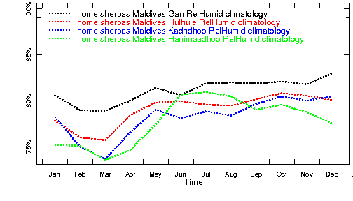 Left : Average Monthly Relative Humidity over Maldives at Gan, Hulhule, Kadhdhoo and Hanimaadhoo for the last 20 years.